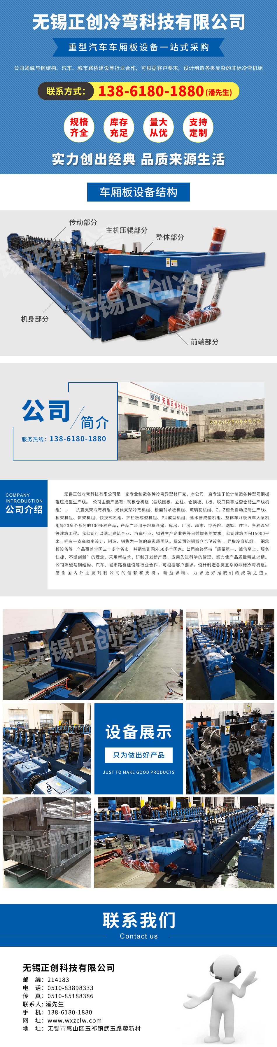 無錫正創冷彎科技有限公司1995年成立,占地面積約15000平方米,專業致力于冷彎型鋼、非、  標鋼結構產品的研發、設計、制造、銷售、外貿于一體的冷彎型鋼設備的專業廠家,并遠銷東亞、南亞、東盟、東歐、獨聯體、大洋洲、南美、拉美、中東、南太平洋、非洲等地。我們期待著與您的合作,歡迎致電咨詢和來廠考察。zclw13目前我公司已成功制造出以下冷彎設備: